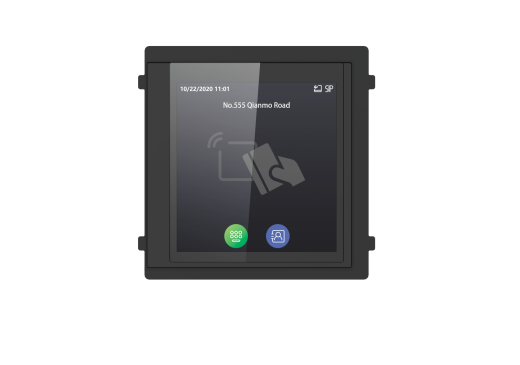 4‘’ IPS сенсорный экран c разрешение 480х480; встроенный Mifare считыватель, режимы сценариев: ввод номера комнаты, ввод пароли доступа, показ списка вызова, демонстрация рекламного видеоролика; DC 12В, питание от основного модуля, 4 Вт; IP65, IK08, -20°C до 60°C 100×100×35мм; пластик.